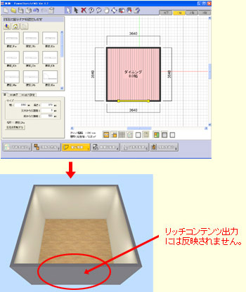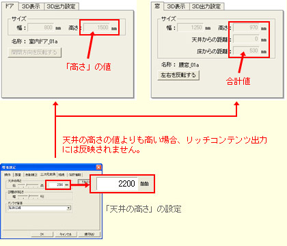 「高さ」の値、または「高さ」「天井からの距離」「床からの距離」の合計値または環境設定パネルの「天井の高さ」の値を調節して、オブジェクトが「天井の高さ」の範囲内に収まるように修正することで、リッチコンテンツ(Web3D)出力に反映させることが出来ます。