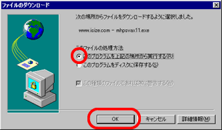 ファイルをダウンロードします。 ファイルの処理方法で「このプログラムを上記の場所から実行する」を選択して「OK」をクリックしてください。